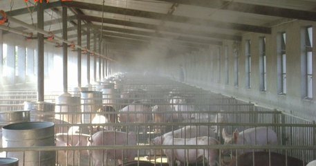 有條件的豬場可購買動力噴霧機(jī),對地面、屋面及豬體噴淋降溫,每天3-4次。