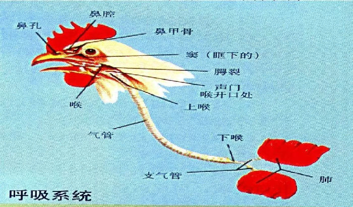 雞的呼吸道包括:鼻腔、口咽腔、喉、氣管、肺和氣囊。