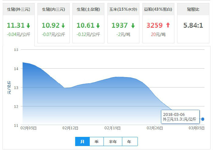 今天是2018年3月6號(hào),全國(guó)外三元豬價(jià)11.31元/公斤。