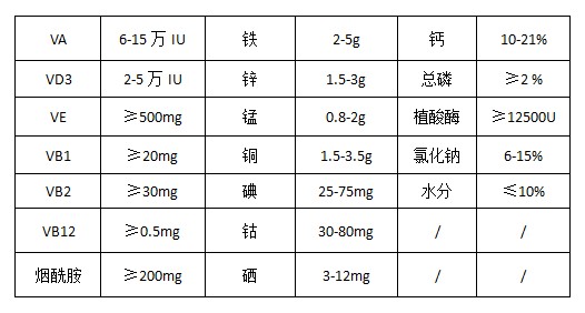 維生素A乙酸酯、維生素D3、dl-a-生育酚乙酸酯、維生素B1 、維生素B2 、維生素B12 、煙酰胺、硫酸亞鐵、硫酸銅、硫酸鋅、硫酸錳、碘酸鈣、氯化鈷、亞硒酸鈉、賴氨酸、植酸酶、復(fù)合酶、抗氧劑、磷酸氫鈣、氯化鈉、碳酸鈣、沸石粉等。