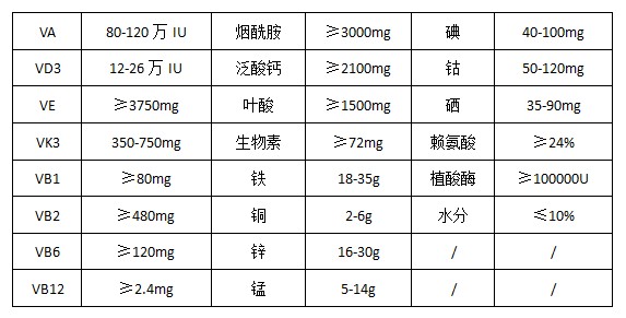維生素A乙酸酯、維生素D3、dl-a-生育酚乙酸酯、維生素K3 、維生素B1 、維生素B2 、維生素B6、維生素B12 、煙酰胺、D-泛酸鈣、葉酸、D-生物素、硫酸亞鐵、硫酸銅、硫酸鋅、硫酸錳、碘酸鈣、氯化鈷、亞硒酸鈉、植酸酶、賴氨酸、抗氧劑、玉米粉、碳酸鈣等。