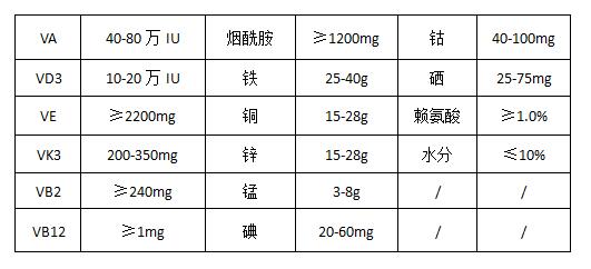 維生素A乙酸酯、維生素D3、dl-a-生育酚乙酸酯、維生素K3 、維生素B2 、維生素B12 、煙酰胺、硫酸亞鐵、硫酸銅、硫酸鋅、硫酸錳、碘酸鈣、氯化鈷、亞硒酸鈉、賴氨酸、抗氧劑、玉米粉、碳酸鈣等。