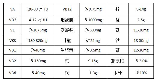 維生素A乙酸酯、維生素D3、dl-a-生育酚乙酸酯、維生素K3 、維生素B1 、維生素B2 、維生素B6 、維生素B12 、煙酰胺、D-泛酸鈣、葉酸、D-生物素、硫酸亞鐵、硫酸銅、硫酸鋅、硫酸錳、碘酸鈣、氯化鈷、亞硒酸鈉、賴氨酸、抗氧劑、玉米粉、碳酸鈣等。