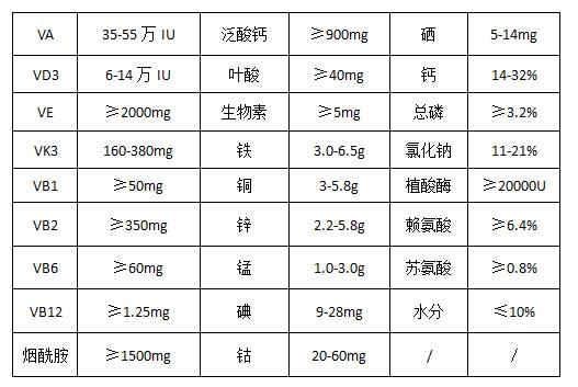 維生素A乙酸酯、維生素D3、dl-a-生育酚乙酸酯、維生素K3 、維生素B1 、維生素B2 、維生素B6 、維生素B12 、煙酰胺、D-泛酸鈣、葉酸、D-生物素、硫酸亞鐵、硫酸銅、硫酸鋅、硫酸錳、碘酸鈣、氯化鈷、亞硒酸鈉、賴氨酸、蘇氨酸、植酸酶、抗氧劑、磷酸氫鈣、氯化鈉、玉米粉、碳酸鈣等。