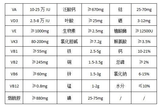 維生素A乙酸酯、維生素D3、dl-a-生育酚乙酸酯、維生素K3 、維生素B1 、維生素B2 、維生素B6 、維生素B12 、煙酰胺、D-泛酸鈣、葉酸、D-生物素、硫酸亞鐵、硫酸銅、硫酸鋅、硫酸錳、碘酸鈣、氯化鈷、亞硒酸鈉、賴氨酸、植酸酶、復(fù)合酶、抗氧劑、磷酸氫鈣、氯化鈉、碳酸鈣、沸石粉等。