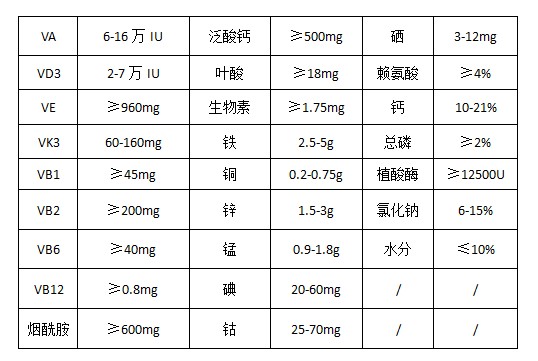 維生素A乙酸酯、維生素D3、dl-a-生育酚乙酸酯、維生素K3 、維生素B1 、維生素B2 、維生素B6 、維生素B12 、煙酰胺、D-泛酸鈣、葉酸、D-生物素、硫酸亞鐵、硫酸銅、硫酸鋅、硫酸錳、碘酸鈣、氯化鈷、亞硒酸鈉、賴氨酸、植酸酶、抗氧劑、磷酸氫鈣、氯化鈉、碳酸鈣、沸石粉等。