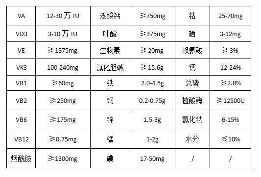維生素A乙酸酯、維生素D3、dl-a-生育酚乙酸酯、維生素K3 、維生素B1 、維生素B2 、維生素B6 、維生素B12 、煙酰胺、D-泛酸鈣、葉酸、D-生物素、氯化膽堿、硫酸亞鐵、硫酸銅、硫酸鋅、硫酸錳、碘酸鈣、氯化鈷、亞硒酸鈉、賴氨酸、磷酸氫鈣、植酸酶、氯化鈉、碳酸鈣、沸石粉等。