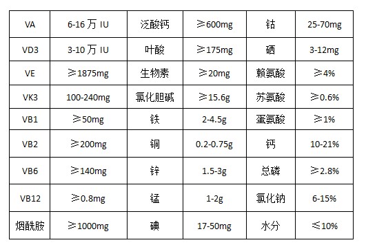 維生素A乙酸酯、維生素D3、dl-a-生育酚乙酸酯、維生素K3 、維生素B1 、維生素B2 、維生素B6 、維生素B12 、煙酰胺、D-泛酸鈣、葉酸、D-生物素、氯化膽堿、硫酸亞鐵、硫酸銅、硫酸鋅、硫酸錳、碘酸鈣、氯化鈷、亞硒酸鈉、賴氨酸、蘇氨酸、蛋氨酸、植酸酶、抗氧劑、磷酸氫鈣、氯化鈉、碳酸鈣、沸石粉等。