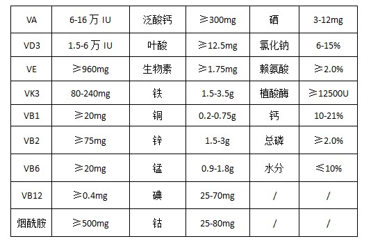 維生素A乙酸酯、維生素D3、dl-a-生育酚乙酸酯、維生素K3 、維生素B1 、維生素B2 、維生素B6 、維生素B12 、煙酰胺、D-泛酸鈣、葉酸、D-生物素、硫酸亞鐵、硫酸銅、硫酸鋅、硫酸錳、碘酸鈣、氯化鈷、亞硒酸鈉、賴氨酸、植酸酶、抗氧劑、磷酸氫鈣、氯化鈉、碳酸鈣、沸石粉、玉米粉等。