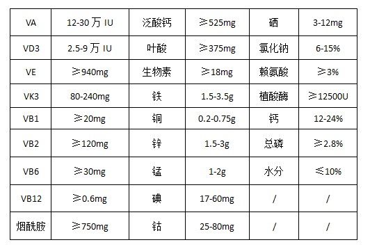 維生素A乙酸酯、維生素D3、dl-a-生育酚乙酸酯、維生素K3 、維生素B1 、維生素B2 、維生素B6 、維生素B12 、煙酰胺、D-泛酸鈣、葉酸、D-生物素、氯化膽堿、硫酸亞鐵、硫酸銅、硫酸鋅、硫酸錳、碘酸鈣、氯化鈷、亞硒酸鈉、賴氨酸、植酸酶、抗氧劑、磷酸氫鈣、氯化鈉、碳酸鈣、沸石粉、玉米粉等。