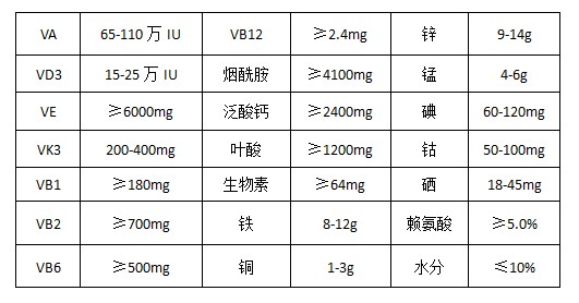 維生素A乙酸酯、維生素D3、dl-a-生育酚乙酸酯、維生素K3 、維生素B1 、維生素B2 、維生素B6 、維生素B12 、煙酰胺、D-泛酸鈣、葉酸、D-生物素、硫酸亞鐵、硫酸銅、硫酸鋅、硫酸錳、碘酸鈣、氯化鈷、亞硒酸鈉、賴氨酸、抗氧劑、碳酸鈣等。
