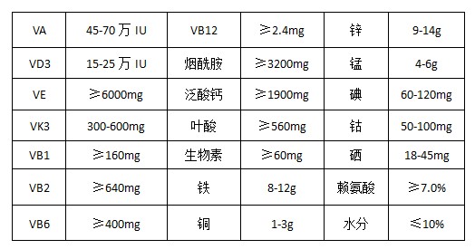 維生素A乙酸酯、維生素D3、dl-a-生育酚乙酸酯、維生素K3 、維生素B1 、維生素B2 、維生素B6 、維生素B12 、煙酰胺、D-泛酸鈣、葉酸、D-生物素、硫酸亞鐵、硫酸銅、硫酸鋅、硫酸錳、碘酸鈣、氯化鈷、亞硒酸鈉、賴氨酸、抗氧劑、碳酸鈣、玉米粉等。