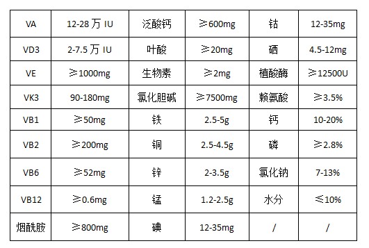 維生素A乙酸酯、維生素D3、dl-a-生育酚乙酸酯、維生素K3 、維生素B1 、維生素B2 、維生素B6 、維生素B12 、煙酰胺、D-泛酸鈣、葉酸、D-生物素、氯化膽堿、硫酸亞鐵、硫酸銅、硫酸鋅、硫酸錳、碘酸鈣、氯化鈷、亞硒酸鈉、賴氨酸、抗氧劑、植酸酶、磷酸氫鈣、氯化鈉、碳酸鈣、沸石粉等。