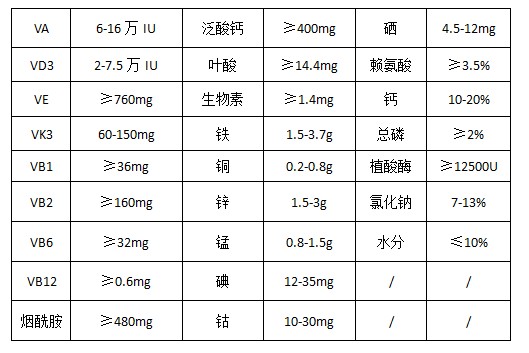 維生素A乙酸酯、維生素D3、dl-a-生育酚乙酸酯、維生素K3 、維生素B1 、維生素B2 、維生素B6 、維生素B12 、煙酰胺、D-泛酸鈣、葉酸、D-生物素、硫酸亞鐵、硫酸銅、硫酸鋅、硫酸錳、碘酸鈣、氯化鈷、亞硒酸鈉、賴氨酸、植酸酶、抗氧劑、氯化鈉、碳酸鈣、磷酸氫鈣、沸石粉等。