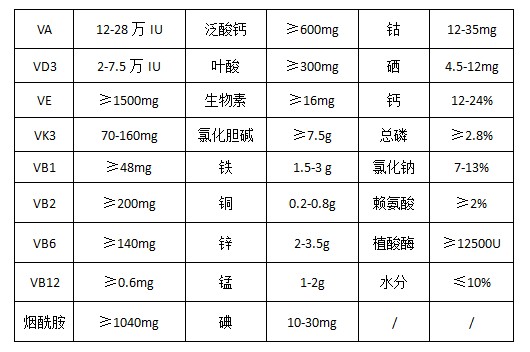 維生素A乙酸酯、維生素D3、dl-a-生育酚乙酸酯、維生素K3 、維生素B1 、維生素B2 、維生素B6 、維生素B12 、煙酰胺、D-泛酸鈣、葉酸、D-生物素、氯化膽堿、硫酸亞鐵、硫酸銅、硫酸鋅、硫酸錳、碘酸鈣、氯化鈷、亞硒酸鈉、賴氨酸、植酸酶、抗氧劑、磷酸氫鈣、氯化鈉、碳酸鈣、沸石粉等。