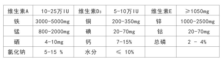 維生素A乙酸酯、維生素D3、dl-a-生育酚乙酸酯、硫酸亞鐵、硫酸銅、硫酸鋅、硫酸錳、碘酸鈣、氯化鈷、亞硒酸鈉、氧化鎂、磷酸氫鈣、氯化鈉、抗氧劑、脫霉劑、碳酸鈣等。